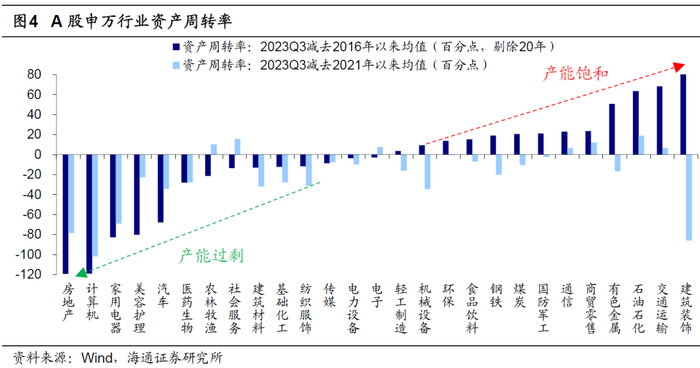 从结构看,本轮产能过剩主要集中在中游科技制造和下游食品和医药。对于国民经济行业,国家统计局有公布产能利用率数据,能够直观反映产能是否过剩,但行业划分较粗;对于更细致的申万行业,可以用上市公司固定资产和在建工程之和的周转率来间接刻画产能利用率。从两种口径看,本轮产能过剩主要分布在:(1)中游科技和制造,对应国民经济行业中的非金属矿物制品业、计算机通信和其他电子设备制造业、电气机械和器材,对应申万行业中的计算机、建筑材料、电力设备;(2)下游地产和消费,对应国民经济行业中的医药制造业、食品制造业、纺织业、汽车制造业等,对应申万行业中的地产、家电、医药、纺织服装。