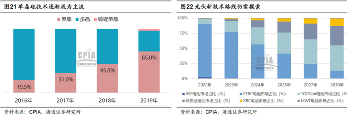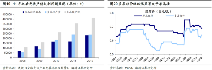 结构性产能过剩的出现意味着现有产能或是无法满足新需求,或是被新技术淘汰,这就意味着过剩的产能并不会在未来被消化,因此产能出清方式并非是“剩者为王”,而是“胜者为王”,即只有凭借产品或技术创新才能在激烈的竞争中存活。典型的例子就是2011年之后光伏的产能过剩困局。自2011年开始,欧美光伏市场萎缩使我国光伏产业陷入困境,2012年下半年美国和欧盟对中国光伏企业展开“双反”调查更是雪上加霜。加之前期光伏企业无序扩张,导致多晶硅出现严重的产能过剩(图16),多晶硅价格大跌。在光伏行业的动荡之中,龙头企业并未表现出更强的韧性,例如最大的多晶硅企业无锡尚德在2013年宣布破产,相反押注单晶硅技术路线的隆基股份后来居上。隆基股份早在2009年就建成一期350MW吨单晶硅片项目,此后不断深耕单晶硅技术路线,2014年隆基股份收购浙江乐叶光伏科技有限公司,开始进入快速扩张期。2015年工信部发布《光伏制造行业规范条件》,2016年之后随着单晶硅成本不断下降,单晶硅技术逐步成为光伏行业的主流,隆基股份一跃成为光伏龙头。