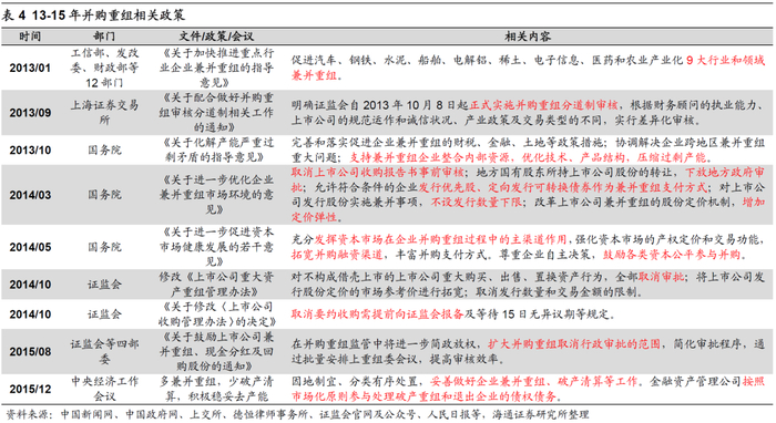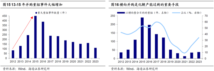 并购重组能够推动企业横向和纵向整合,优化资源配置效率。例如13-15年国务院、证监会等部门致力于减少并购重组行政审批限制,拓宽并购重组融资渠道。2013/10/15国务院《关于化解产能严重过剩矛盾的指导意见》指出,支持兼并重组企业整合内部资源,压缩过剩产能。2014/10/23证监会修订《上市公司资产重组管理办法》,对不构成借壳上市的上市公司重大购买、出售、置换资产行为,全部取消审批。随着并购重组市场化改革持续深化,15年重大重组事件数量较12年增长超过4倍,其中横向并购占比由40%提升至60%左右,有利于强化优势企业的拉力效应。