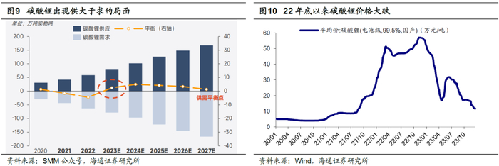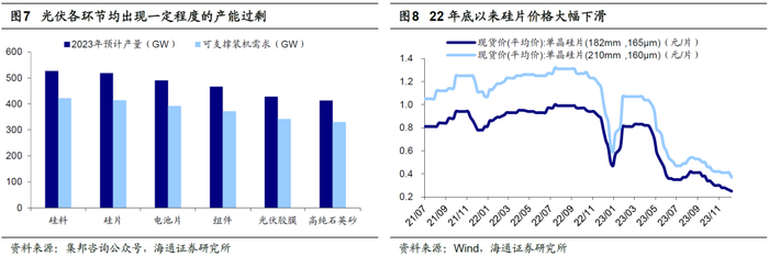 对于新兴产业而言,尽管中长期需求依然旺盛,但前期众多企业竞相扩大产能,导致出现阶段性产能过剩的问题。例如,医药制造业产能过剩最为严重,但医药行业细分领域众多,不可一概而论。医药行业产能过剩问题在原料药领域较为突出,根据前瞻产业研究院数据,2022年原料药产量为363万吨,需求量仅为296万吨,供大于求使得原药价格自21年10月底高点最大跌幅达59%;此外,由于前些年CXO公司大幅增加资本开支,而CXO产能建设周期基本在1-3年左右,其中CDMO在2-3年左右,因此当行业需求下行时供给依然在扩张,进而出现产能过剩。另一个典型案例是电气机械制造,尤其近年来飞速发展的新能源产业,过去2-3年光伏装机持续高增,新能源汽车销量节节攀升,在中长期前景和短期利润的驱使下,相关产业链上的企业为了提升市场份额纷纷扩大产能,因而导致产能过剩问题,例如根据集邦咨询数据(图7),光伏各产业链均出现产能过剩,硅片价格自22/08高点下滑超过70%,锂电池关键材料碳酸锂在23年出现供大于求的局面(图9),碳酸锂价格自22/11高点下滑近80%。