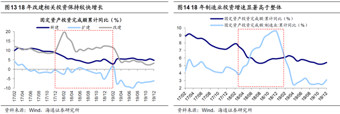 产能置换能够拉动制造更新投资,促进制造业技术升级。例如17-18年发改委等部门持续推进产能置换和智能化、绿色化设备改造升级。2017/04/17发改委《关于做好2017年钢铁煤炭行业化解过剩产能实现脱困发展工作的意见》指出,加快推进钢铁制造技术的信息化、数字化,严格落实煤矿减量置换要求。2018/01/08工信部修订《钢铁水泥玻璃行业产能置换实施办法》,进一步加严置换比例要求。在设备改造的政策导向下,制造业设备更新投资迅速增长,2018年改建相关投资增速达11%,明显高于新建/扩建投资的3%/0%,制造业投资增速亦突破整体达9%。