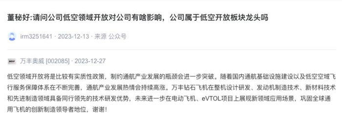 万丰奥威:积极发展纯电动飞机 计划逐步实现eVTOL项目商业化落地