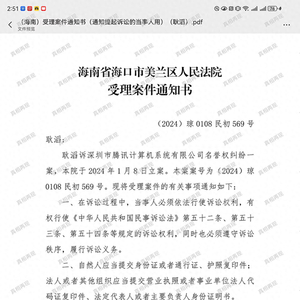 美兰区人民法院的受案通知书显示,耿滔诉腾讯公司名誉权纠纷一案,该院已在2024年1月8日立案。