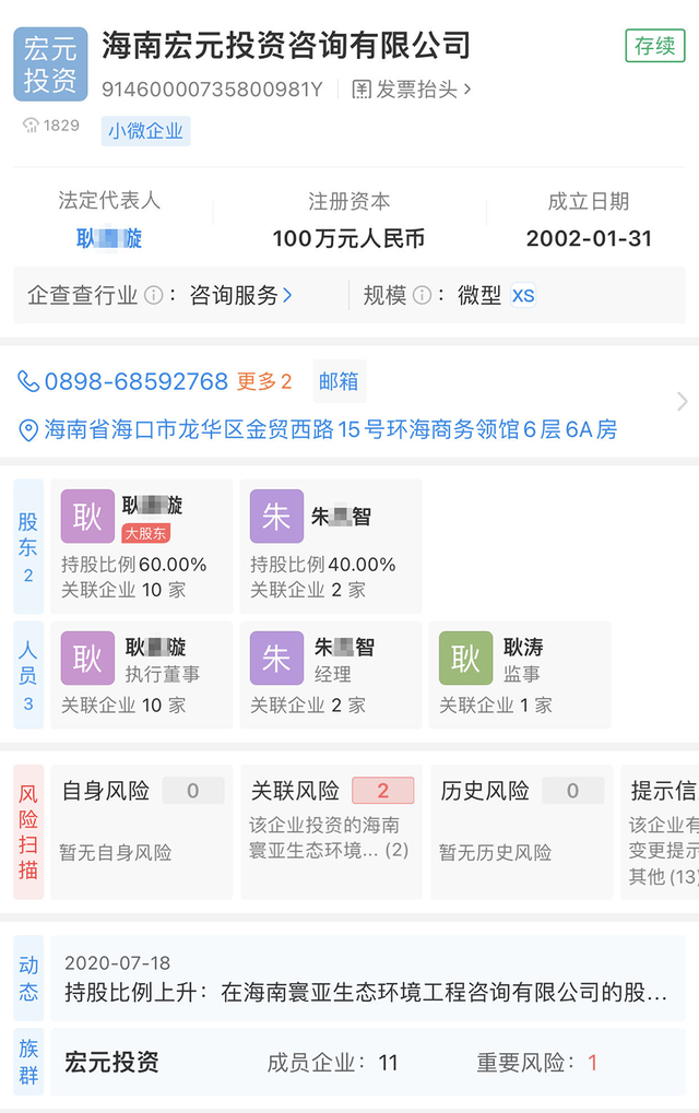上述文章称,2015年11月以前,耿滔无论是在官方报道还是工商注册信息里,都叫耿涛,2015年11月换发身份证后他的名字改为耿滔,身份证出生年月也变为1972年11月。2002年1月31日至今,耿滔在耿某璇与朱某智成立的海南宏元投资咨询有限公司(以下简称:宏元投资公司)任监事。