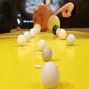 “企鹅蛋比鳄鱼蛋还大一点?”走进全球首个蛋品科技馆,开门见山的就是18枚大小各异、形形色色的“蛋”,从大到小竖立在展台上,依次排开:兽脚亚目恐龙蛋、象鸟蛋、鸵鸟蛋、奇异鸟蛋、松蛇蛋、鸸鹋蛋、鹅蛋、企鹅蛋、鳄鱼蛋、火鸡蛋、鸭蛋,其后便是人们熟识的4种鸡蛋:粉壳蛋、白壳蛋、青壳蛋、褐壳蛋,以及比它们更小的鸽子蛋、鹌鹑蛋、斑鸠蛋。当然,全馆的唯一主题就是鸡蛋及其周边。