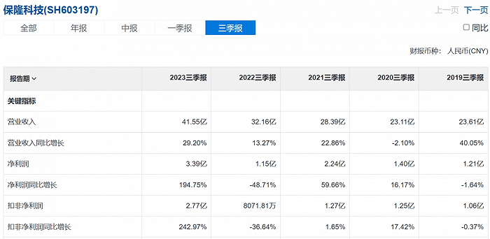 2023年前三季度,保隆科技实现营收41.55亿元,同比增长29.2%;实现归母净利润3.39亿元,同比增长194.8%。其中,空气悬架增长显著,正在成为公司新的增长点。
