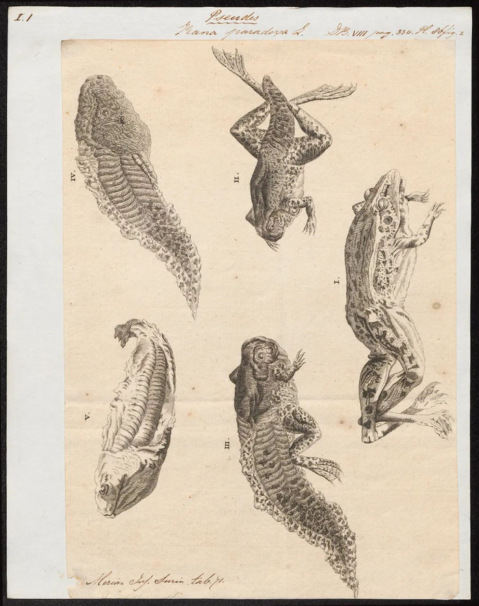 后来,塞巴将这一发现记录在了自己的著作中,瑞士博物学家玛丽亚·西碧拉·梅里安(Maria Sibylla Merian)将这一奇特物种命名为鱼蛙(Rana piscis)。就连大名鼎鼎的现代分类学之父——卡尔·林奈(Carl Linnaeus)也相信了这一说法,他把“鱼蛙”写进了第一版《自然系统》(Systema Naturae)的“悖理动物”(Animalia Paradoxa)部分,与“鱼蛙”一同列入其中的还包括九头蛇、独角兽、凤凰等神奇生物。