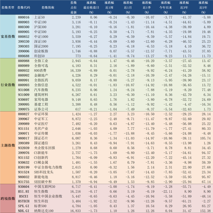2024年1月15日A股主要指数涨幅情况