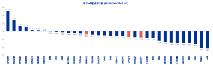 农林牧渔(-1.1%):上周农业板块下跌,市场博弈养殖业去产能预期。猪肉:据农业农村部以及博亚和讯数据,生猪(外三元)全国均价下跌4.3%,猪肉批发均价下跌2.1%。国家统计局2023年12月CPI数据下降0.3%,其中食品分项的猪肉价格下降26.1%,降幅收窄5.7个百分点,影响CPI下降约0.43个百分点,是带动CPI同比下降的主要因素。短期部分养殖集团出栏压力仍大,需求端屠宰企业订单少,预计北方腊八会对需求有短期提振,但中期依然不改供过于求的局面。