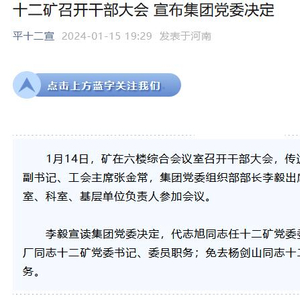 中新经纬1月15日电 据平顶山天安煤业股份有限公司十二矿官方微信1月15日消息,1月14日,十二矿召开干部大会,宣布集团党委决定。代志旭任十二矿党委委员、副书记、矿长;免去吕有厂十二矿党委书记、委员职务;免去杨剑山十二矿党委副书记、委员、矿长职务。