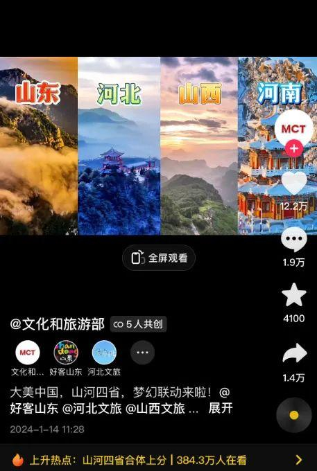 “河北文旅”火速改ID,并“疯狂输出”70余条视频;“河南文旅”频繁更新,被网友调侃“题海战术”,截至1月15日17时,其抖音平台发布内容已超过1.2万;“山东文旅”发布“都是东、同根生”视频;“山西文旅”也“激情喊话”。四省也在文化和旅游部官方账号携手发布文旅大片。关于“山河四省”的话题也在抖音、微博等社交媒体持续发酵。