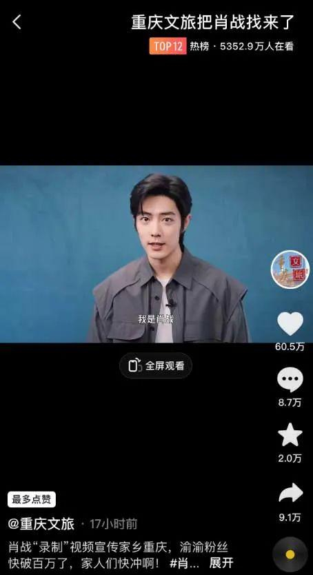 “重庆文旅”也放出“大招”,邀请肖战为重庆录制宣传视频,助力家乡“C位出道”。该视频登上短视频平台热榜。肖战在宣传视频中介绍:“重庆是一个好山好水、来了就走不出去的漂亮的魔幻城市,欢迎大家来重庆旅游。”