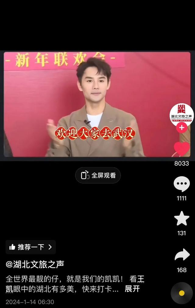 “湖北文旅之声”1月14日发布了演员王凯推介湖北的短视频。视频中王凯表示,“春暖花开的时候特别适合去武汉看一看。”王凯推介了武汉的樱花、户部巷、早点、汉街、杜莎夫人蜡像馆等。