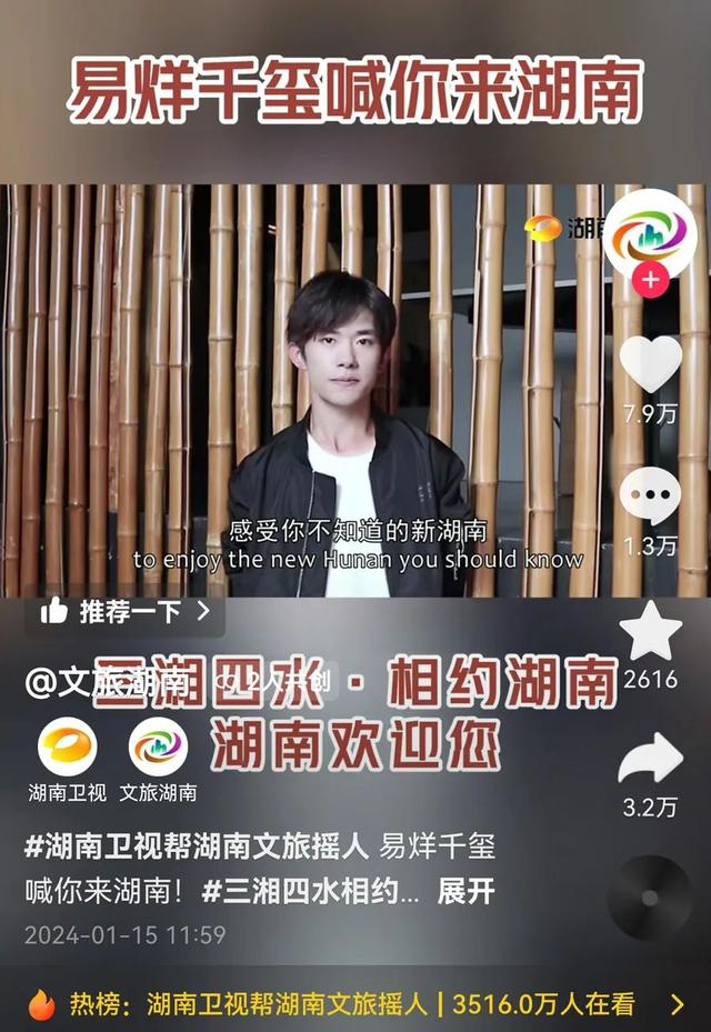 在湖南省文化和旅游厅发布的视频中,洞庭湖、岳阳楼、凤凰古城、东江湖、橘子洲头等美景一一呈现。易烊千玺在视频中说,“创新湖南,融入世界。欢迎全世界的朋友和我一起感受你不知道的新湖南。”
