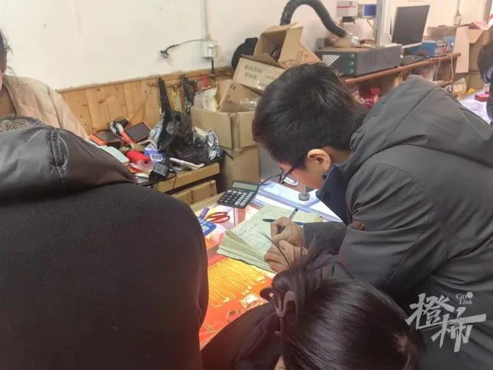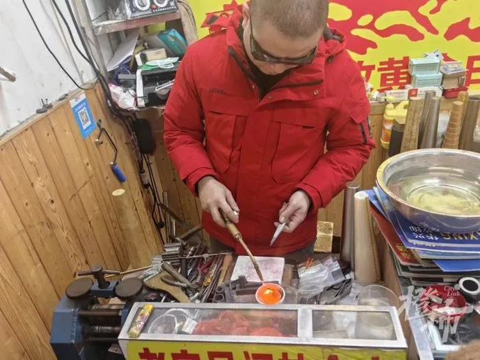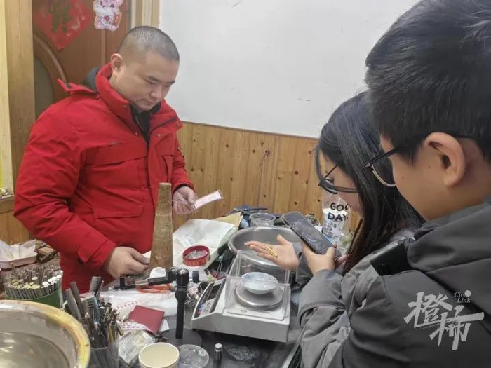 橙柿记者来到杭州半山的一家打金店,中午11点半,不足20平方的小店已经挤满了年轻人,一身红衣的中年男性正埋头打磨着金器,他便是林老板,操作台前几位姑娘好奇地盯着。