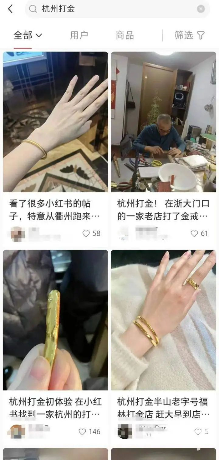 橙柿记者在社交平台搜索“杭州打金”发现,许多博主交流了用金条打首饰的经历和攻略。