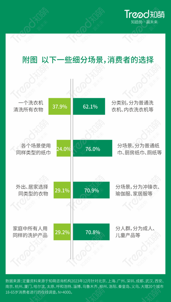 我们今天看到很多产品的场景,比如,大家期待现在洗衣机分的越来越细,洗内衣、洗袜子、洗鞋的,很多人家里不只一台洗衣机,要有多台洗衣机;今天使用一个生活用纸,同样分的越来越细,从厕所用纸到厨房用纸,有更多的场景分类,甚至一个日化用品也会针对家中不同的成员进行分类。所以,消费者更细腻的日常生活场景中的需求,就成为了新品类和新品牌开创市场的重要切入点。