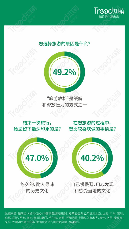 但是,大家今天为什么要去旅游?接近一半消费者认为旅行放松是释放压力的重要方式,“旅游的目的胜过目的地”。这句话含义很深,消费者在重新思考为什么要旅游?大山、大江、大河不再是吸引旅游的唯一理由,因为大家追求的是在旅游当中的松弛感。大家要去发现在地的文化,发现在地的烟火,发现要慢下来真正体验这个城市的人文氛围,消费者对“新烟火气息的体验式追逐”更加明显,更愿意为“能构成我人生特殊体验”的内容、具有文化底蕴的城市烟火、以及回归生活本真的当下质感买单。