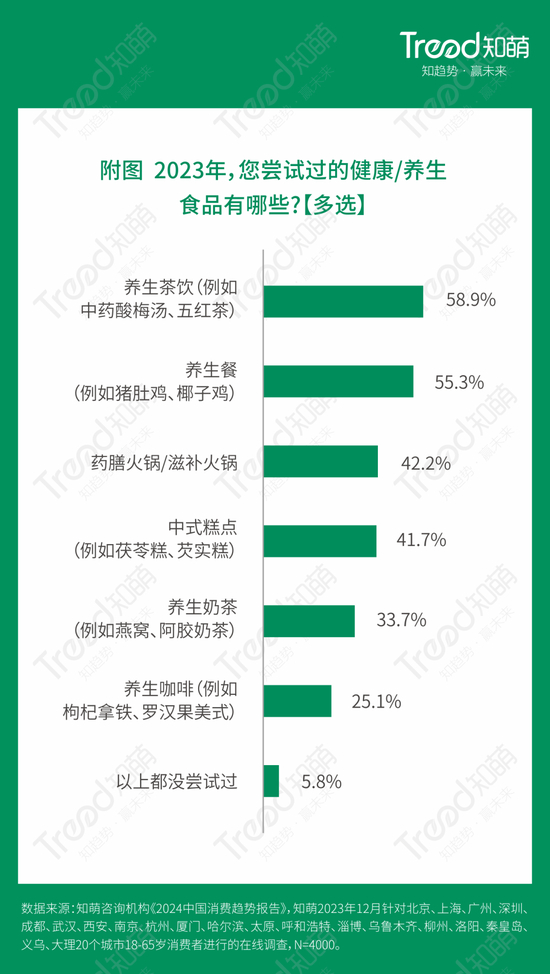 消费者认为的健康是什么?花式养生五大件出炉:早睡早起、吃针对性保健品、健身运动、睡前热水泡脚、喝养生茶,这也催生了中式养生新趋势,2023年的热门话题中,“脆皮年轻人”成为热词,意为“年纪轻轻却毛病多多的人”,体现出他们对健康体魄的焦虑和渴求,令养生内容热度持续升高,越来越多的年轻人加入中式养生大军。左手泡枸杞,右手人参茶,晨起八段锦,睡前按按摩,中医养生意识和理念也在不断渗透和流行,从养生茶、养生餐、养生火锅,甚至今天的烘焙糕点都带有养生功能,众多“新中式养生”产品也不断涌现。