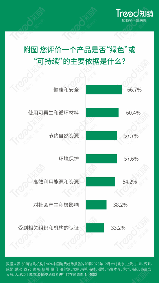 消费者也越来越关注绿色低碳和可持续的产品及品牌,调查显示,大部分消费者会因为产品是绿色或可持续的产品,而更倾向于购买该品牌的其他产品。消费者判断一个产品是否“绿色”和“可持续”的依据有健康和安全、是否使用可再生和循环材料、是否节约自然资源、环境保护和是否高效利用能源资源等。