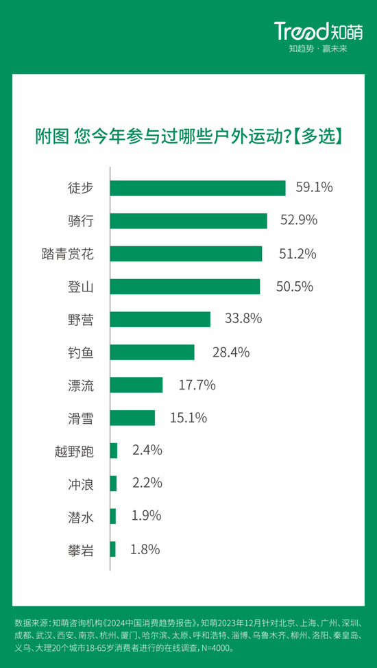 知萌2024年中国消费趋势研究显示,在2023年有65.3%的消费者外出次数增加,户外呈现出从小众向大众发展的趋势。