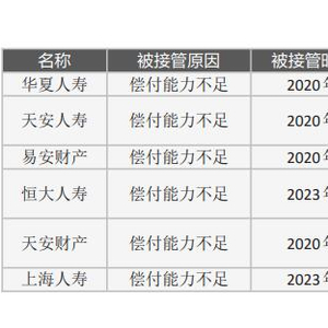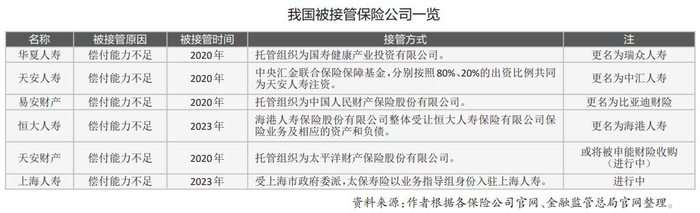 近年来,我国经济发展进入新常态,经济增长速度放缓,质量提升,财政货币政策保持宽松,各期限利率中枢下移明显。未来,国内经济增速区间换挡,资本边际报酬递减,投资需求下降,人口老龄化加重以及国内外利差缩小等形势,长期压低我国市场利率。低利率环境下,中小保险公司面临再投资风险加大、估值压制以及盈利空间压缩等多方面压力,在利差损拖累下,2020年以来,我国共有6家险企被接管。另外,国家金融监督管理总局数据显示,我国保险业C、D类风险综合评级的保险公司近3年明显增多,2020年共计6家,2021年上涨到12家,2022年上涨到27家,年复合增长率达到112.5%,偿付能力不达标的险企均为中小保险机构(见表格)。
