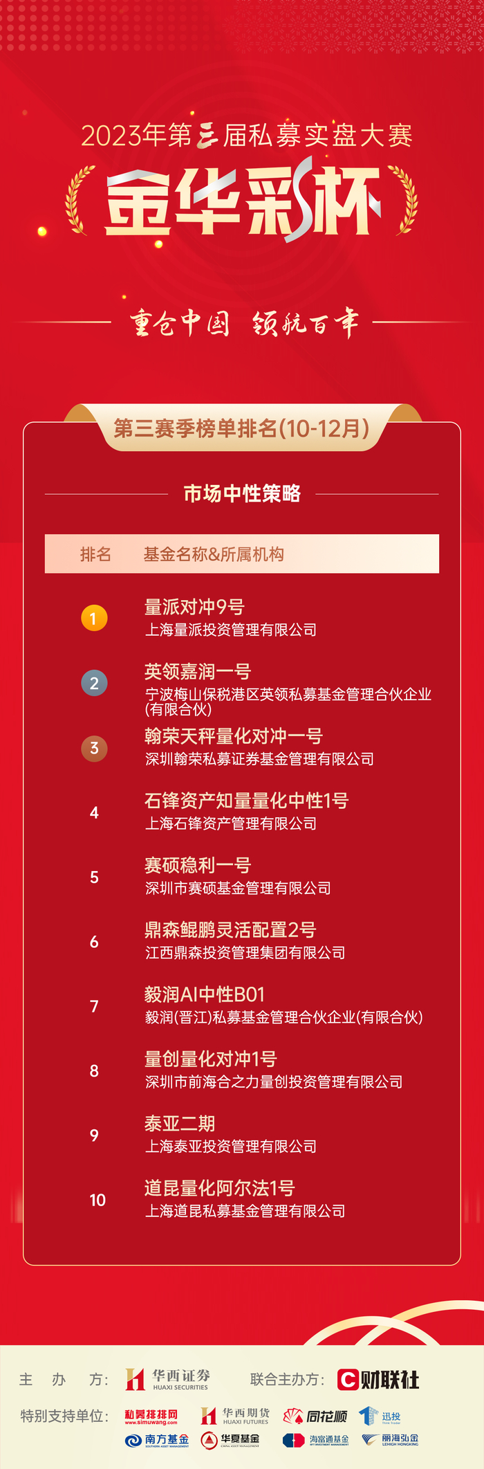 第三赛季(10-12月)市场中性策略组综合表现前三名的分别是上海量派投资管理有限公司旗下的量派对冲9号、宁波梅山保税港区英领私募基金管理合伙企业(有限合伙)旗下的英领嘉润一号、深圳翰荣私募证券基金管理有限公司旗下的翰荣天秤量化对冲一号。