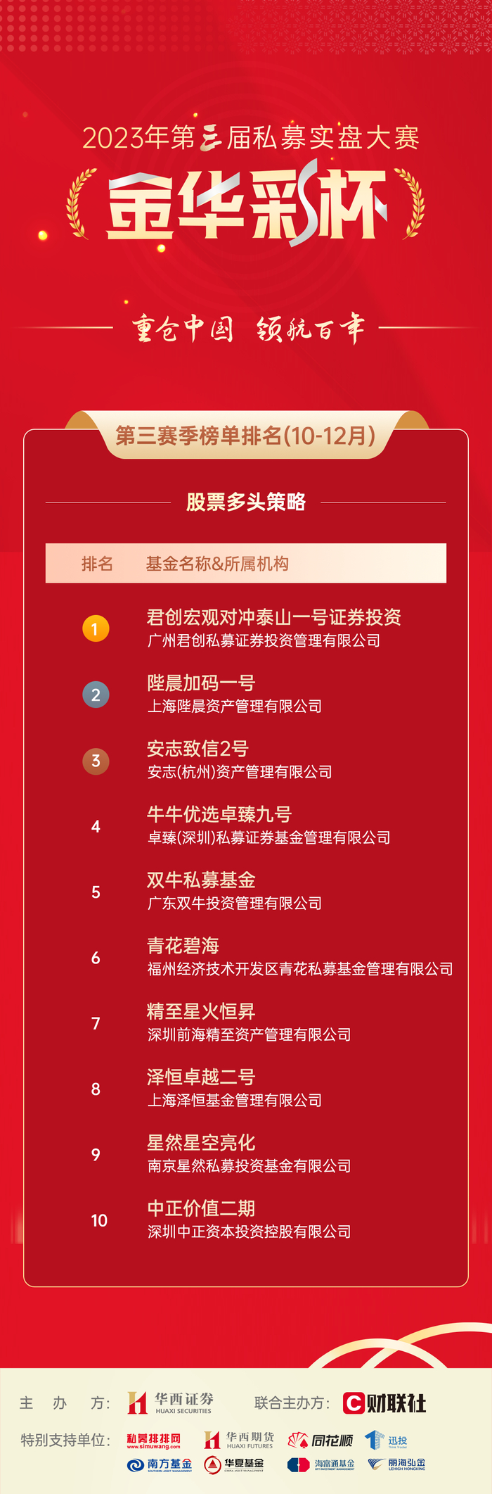 为挖掘和培育优秀私募机构,依托长期以来精心打造的“金华彩”私募综合服务品牌,华西证券继续整合银行、信托、保险、媒体等机构资源,隆重推出“金华彩杯”第三届大赛,旨在进一步构建优质的私募业务生态,为私募管理人提供全生命周期、一站式综合金融服务。