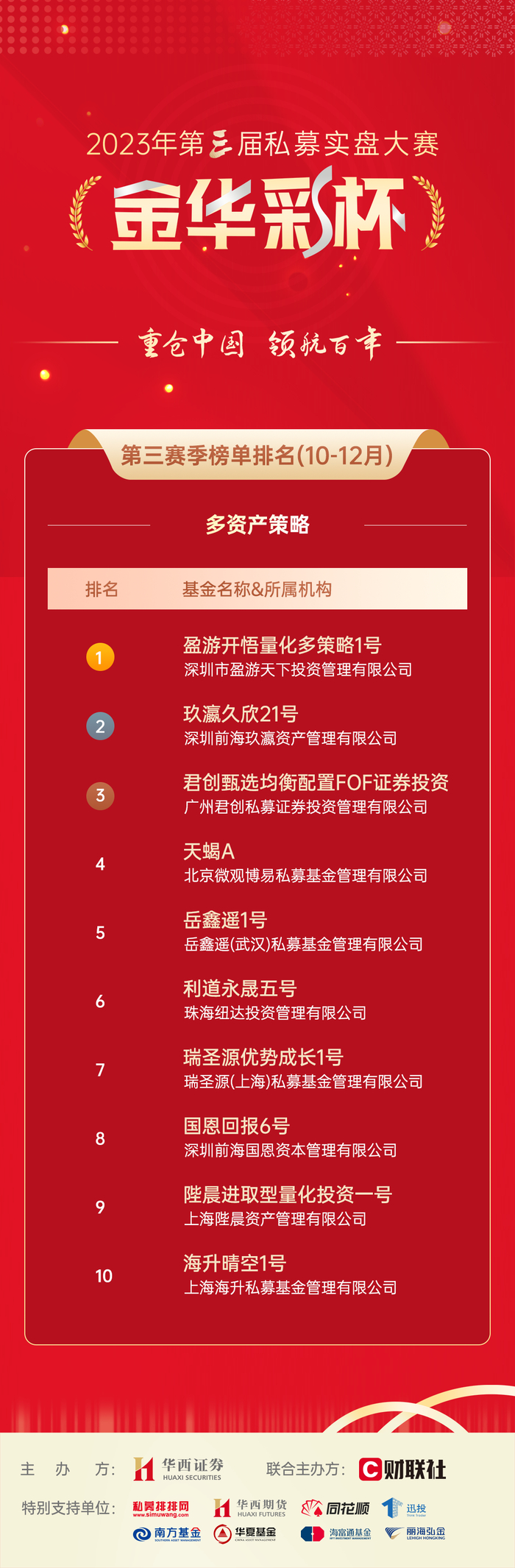 广州君创私募证券投资管理有限公司成立于2017年,公司以投资者长期利益为核心驱动,秉承价值成长投资和长期投资理念,聚焦于权益投资领域,组建了领先的行业专家型研究团队,多维度严苛筛选优质赛道的好企业加以投资。公司同样也获得了第三赛季(10-12月)多资产策略组前三名的好成绩。