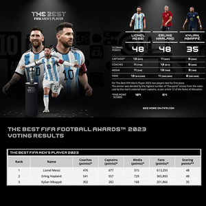 最终,梅西、哈兰德均获得48分,梅西凭借队长第一顺位选票多获奖——107名队长投票第一顺位选择梅西,64名队长投票第一顺位选择哈兰德。