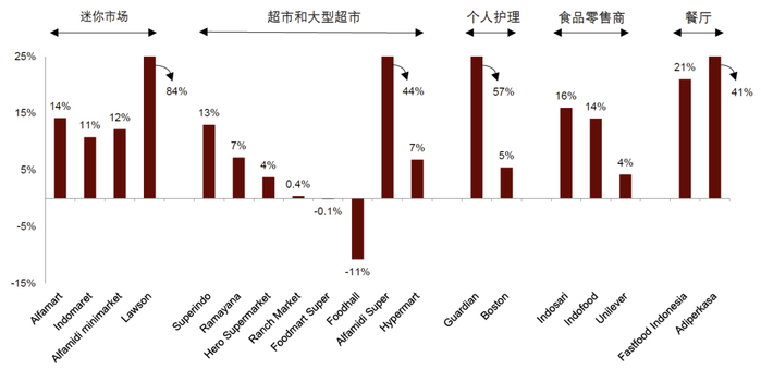 由于Lawson和Midi Fresh仍处于早期发展阶段,我们预计它们将优先增加门店数量,因此目前的单店销售额水平可能并未体现其最佳水平。与此同时,除Super Indo之外的超市和大型超市单店销售额出现大幅下降(超过一半),未来有望回升。Super Indo得益于其门店选址策略,是唯一发展良好的超市品牌。