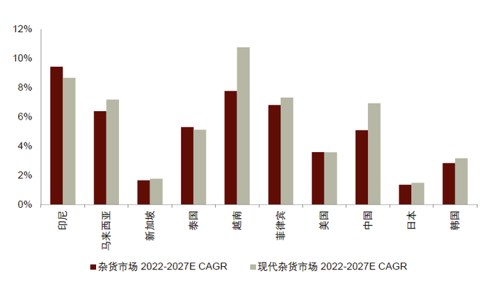 图表3:2022-2027年各国食品杂货零售行业和现代食品杂货零售行业的复合年增长率