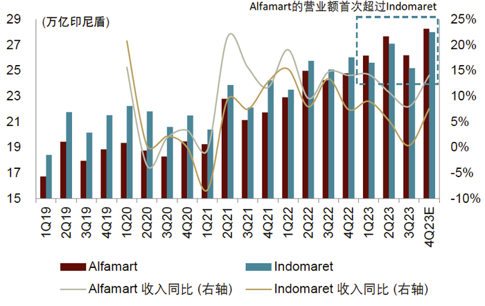印尼的迷你超市和便利店行业是一个双寡头市场,由Indomaret(截至2023年三季度有22,080家门店,2022年营业收入为100万亿印尼盾)和Alfamart(截至2023年三季度有21,516家门店,2022年营业收入为97万亿印尼盾) 主导。虽然Indomaret 在门店数量和营业收入上一直处于领先地位(自2022年以来Alfamart的利润更高),但我们观察到了一些发展中的趋势,这可能标志着迷你超市行业长期结构性转变的开始。