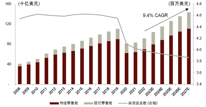图表4:2022-2027年印尼食品杂货零售行业的复合年增长率有望达到9.4%,2027年规模有望达到1,430亿美元