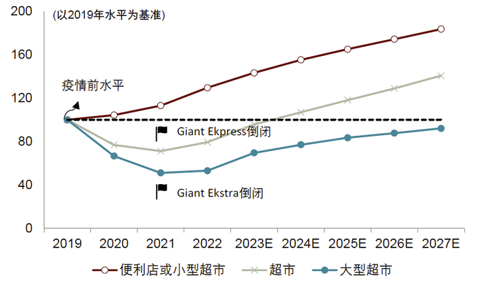 图表15:根据欧睿的数据,印尼超市和大型超市行业可能分别要到2024年和2027年之后才会恢复到疫情前的水平