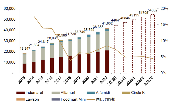 根据欧睿的数据,我们预计,印尼的迷你超市(或便利店)行业在2022-2027年期间的复合年增长率有望达到7.2%,到2027年有望达到212亿美元,占现代食品杂货零售行业65%的市场份额。这一增速虽然低于疫情期间(2019-2022年受积极的门店扩张推动,复合年增长率达到9%),但在该行业已然经历一段持续的高增长期的基础上,我们认为这一增速仍然可观。我们预计,门店数量有望从2022年的41,183家增加到2027年的54,032家,对应复合年增长率为5.6%;单店销售额有望从2022年的36万美元增加到2027年的39万美元。