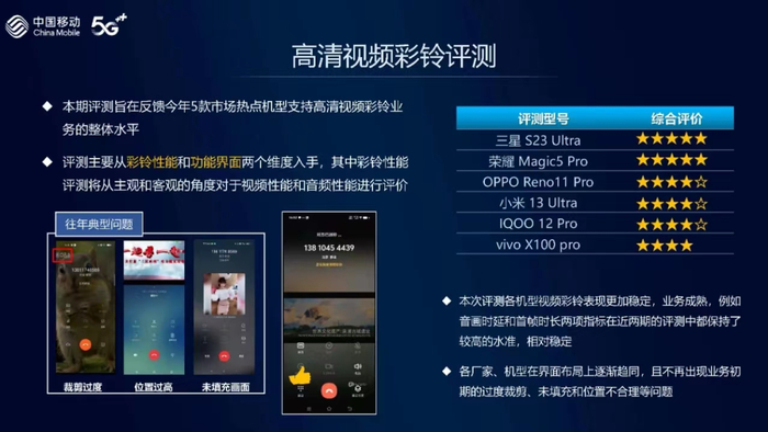 本次评测各机型视频彩铃表现更加稳定,业务成熟,例如音画时延和首帧时长两项指标在近两期的评测中都保持了较高的水准,相对稳定。各厂家、机型在界面布局上逐渐趋同,且不再出现业务初期的过度裁剪未填充和位置不合理等问题。