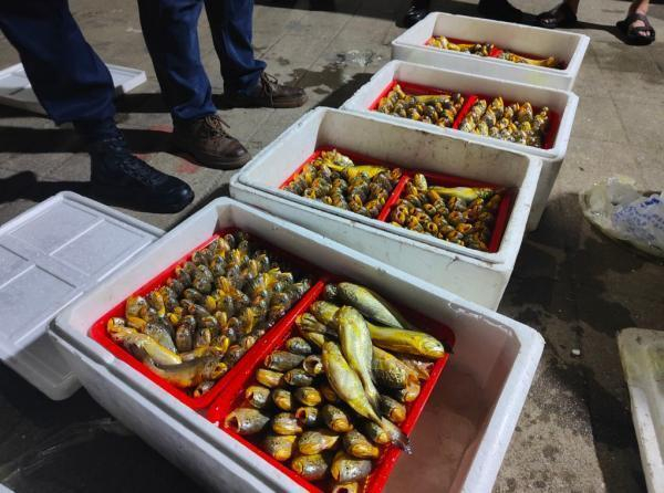 警方查获鱼贩非法捕捞的部分渔获。