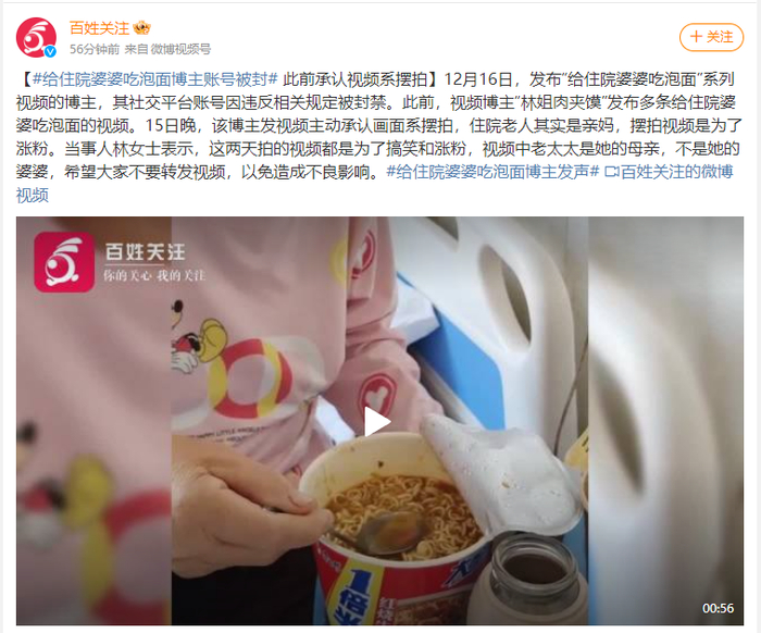 2023年12月16日,据媒体报道,发布“给住院婆婆吃泡面”系列视频的博主,其社交平台账号因违反相关规定被封禁。