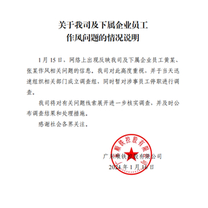 1月15日,网络上出现反映我司及下属企业员工黄某、张某作风相关问题的信息。我司对此高度重视,并于当天迅速组织相关部门成立调查组,同时暂对涉事员工停职进行调查。
