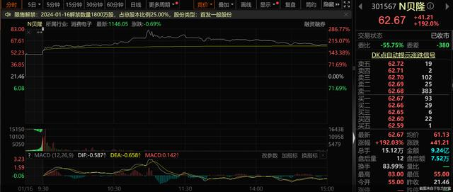 交易行情显示,1月16日,贝隆精密高开156.29%,开盘价为55元/股,盘中股价不断上攻,因成交价较开盘价首次上涨达到或超过30%,贝隆精密盘中还出现了临时停牌的情形,盘中涨幅一度上涨逾280%,最高价触及83元/股。截至1月16日收盘,贝隆精密报62.67元/股,收涨192%,总市值为45.12亿元,换手率为83.99%,成交金额合计9.24亿元。