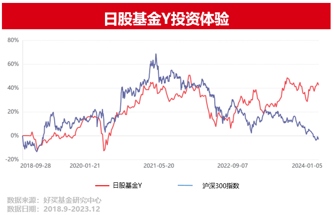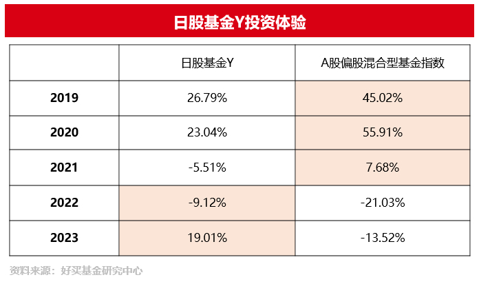 如果看2019年到2023年五年的投资成果,日股基金Y的年化回报10.62%,A股偏股混基金指数年化回报11.04%,两者相差不多。