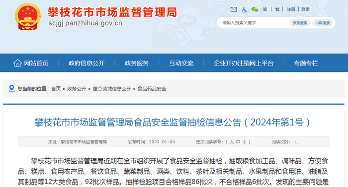 四川省攀枝花市市场监督管理局食品安全监督抽检信息公告(2024年第1号)