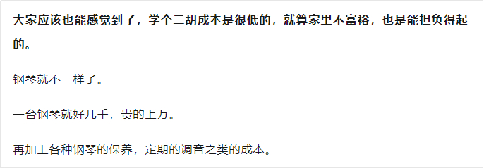 社交平台上,有人将钢琴和二胡拿来对比,称学二胡成本很低,钢琴就不一样了。“一台钢琴就好几千,贵的上万。”
