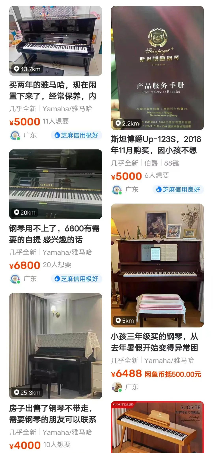 崩盘的不只是一手市场。如今,在闲鱼上,有很多卖家在出售二手钢琴。有人买琴花了两万多,直接七千多转让,有人不仅折价转让,送琴凳送节拍器等,恨不得一股脑全部清仓甩卖。