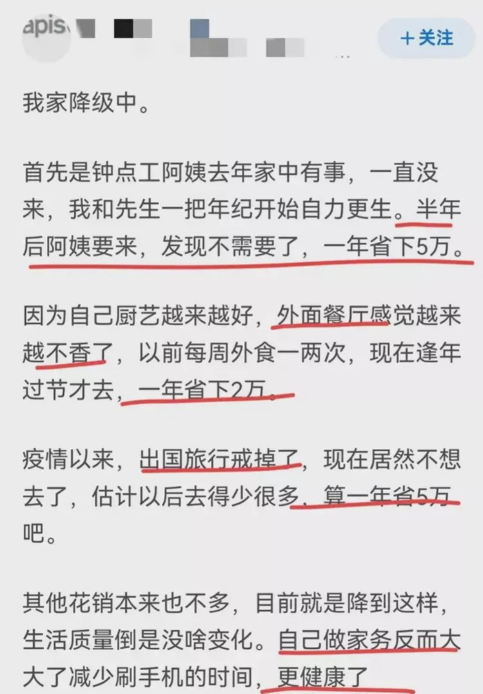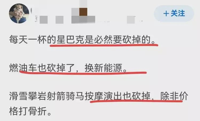2023年,有人在网络上表示,砍掉了钟点工阿姨、外出就餐、出国旅行,一年省下12万;有人砍掉了高端化妆品,连直播间都不进了;有人砍掉了留学计划,房子也不买了;有人砍掉了燃油车,换上了新能源;有人开始闲鱼卖闲置......