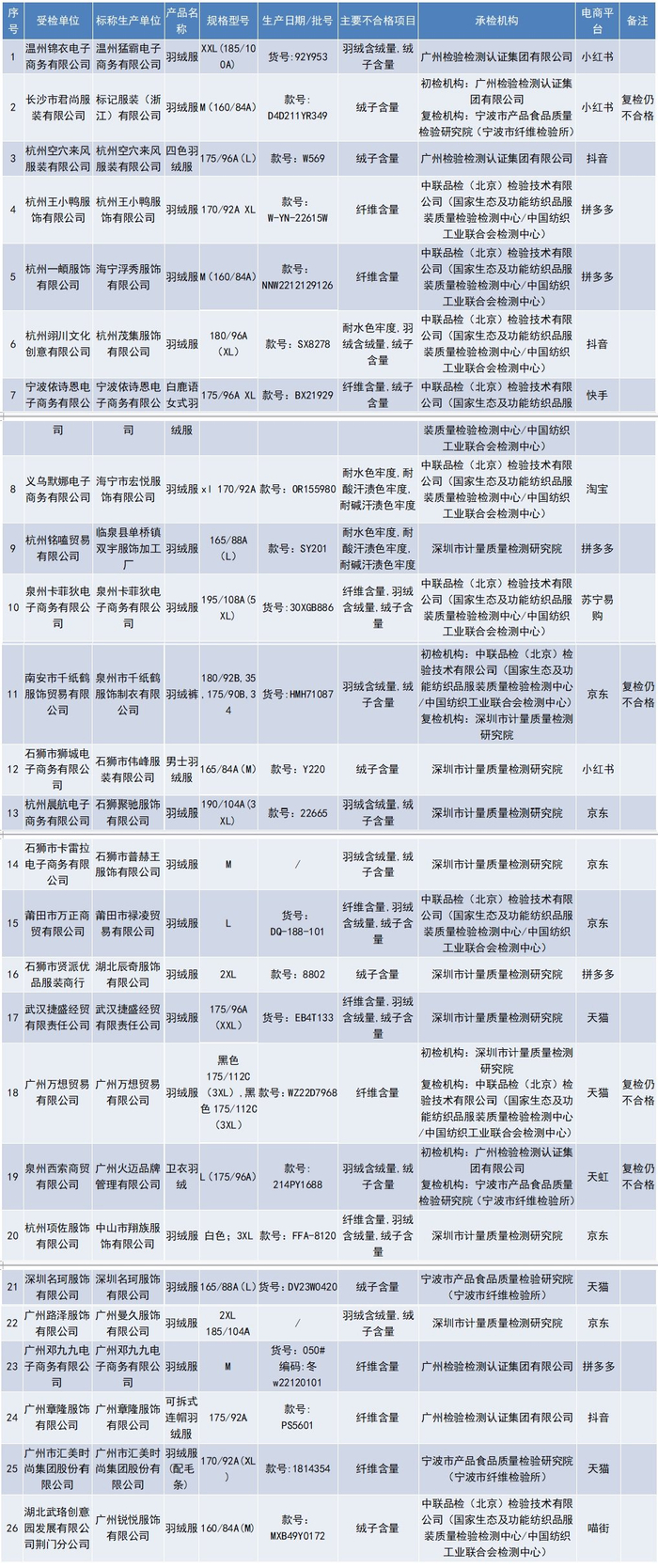 “标记”“白鹿语”“千纸鹤”“茵曼”等26批次羽绒服不合格