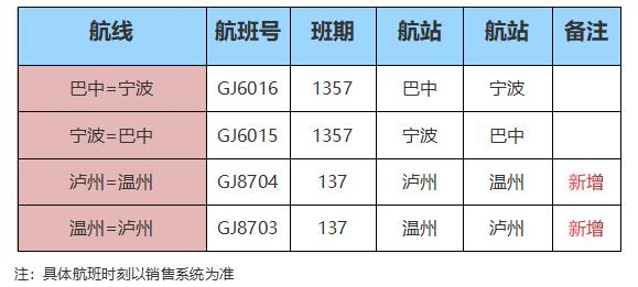 此外,在四川区域新增泸州=温州航线,加班巴中=宁波航线: