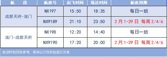 澳门航空:成都=澳门航线春节增班