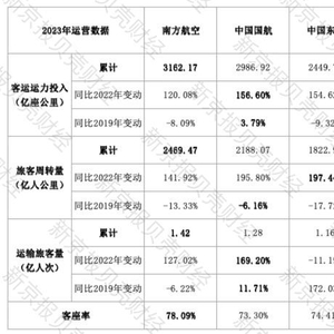 此外,中国国航2023年客运运力投入2986.9亿座公里,较2022年增长156.6%,较2019年增长3.8%;中国东航客运运力投入同比增长154.62%至2449.75亿座公里,恢复至2019年的90.7%。南方航空是2023年三大航中客运运力投入最高的航司,较2022年增长120.08%至3162.17亿座公里,恢复至2019年的91.9%。三大航2023年客运运力投入共8598.84亿座公里,恢复至2019年的95%。